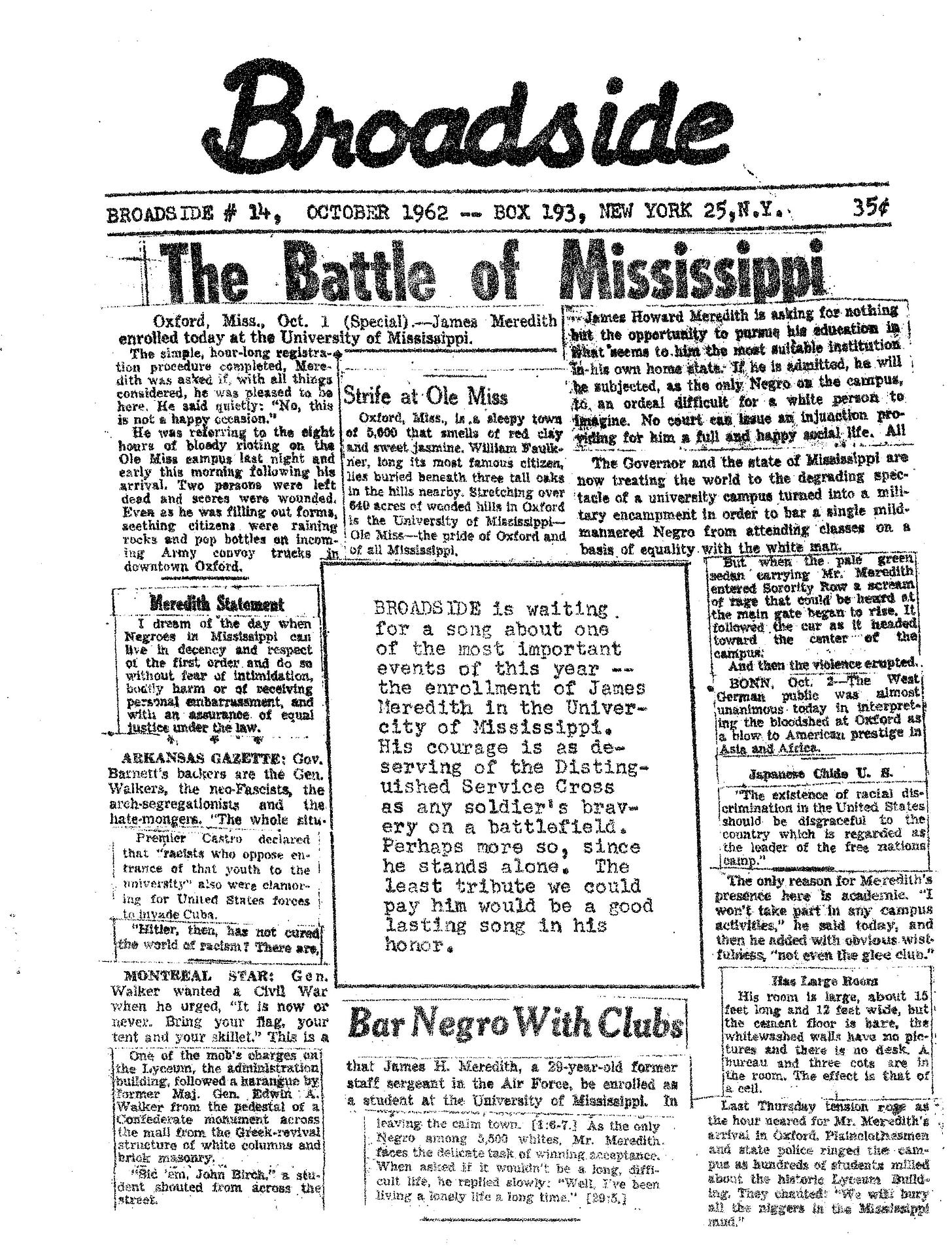 When Bob Dylan’s voice rang out over the loudspeaker, people came flocking from all areas of the Festival park. There were few in the largely youthful crowd who had not heard Bob before. They seemed to like him not only for his poetry and song but also as the uncombed rambler kid who embodies many of the anti-material values his young audience is reaching for. They yelled for him before he walked up and yelled twice as hard when he finished up the workshop with Pete Seeger, the two of them singing Bob’s “Playboys and Playgirls” (Broadside #20). Topical music had shown its range and depth at Newport.