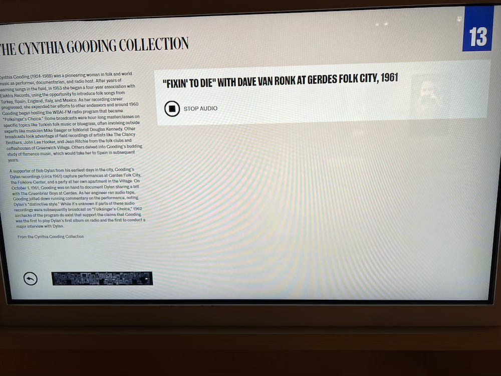 She also captured Bob in the clubs. In the Archive Wall, there's a great clip of Dave Van Ronk and Bob Dylan doing “Fixin’ to Die.” It sounds like it's closing time because they're just talking. They're joking about “Pretty Peggy O.” She also had a house party recording as well in there.