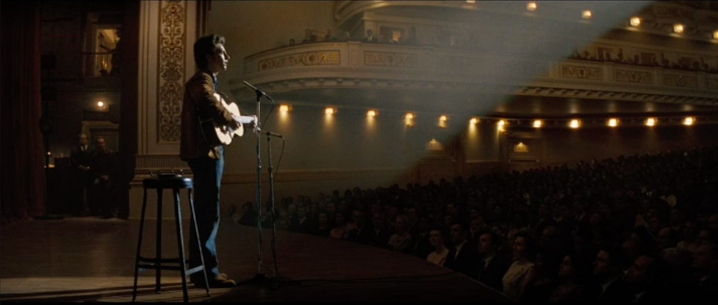 For all the movie’s looseness with facts, Dylan did indeed debut “Hard Rain” as part of his five-song set at Carnegie Hall. And the brief intro Seeger gives Bob is also a bit inscrutable. On the tape, he simply tells the audience Bob is “a very prolific guy”—which is certainly true, but not explicitly praise.