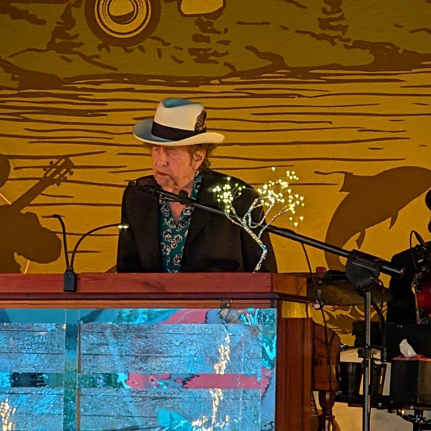 The venue presents serious music fans with a hard choice: is it all worth it, knowing full well that the Chainsaw Massacre zombies walking back and forth across your sightline (and back and forth and…where are they going, and do they ever get there?) or the Bud Light-fueled incessant chatterers might awaken previously unknown homicidal impulses? For me, the prime experience of a Dylan performance is catching all the little nuances. The micro-interplay between the players. Bob’s never-the-same-twice vocal interpretations. The ever-shifting arrangements. Bob’s nods and cues, smiles and frowns. These are the things that for me make a Dylan concert unlike few other experiences in our world: spending time in the presence of a genius for the ages who is still creating in the moment, not recreating past glory. An enormo-shed is far from the ideal environment to say the least.