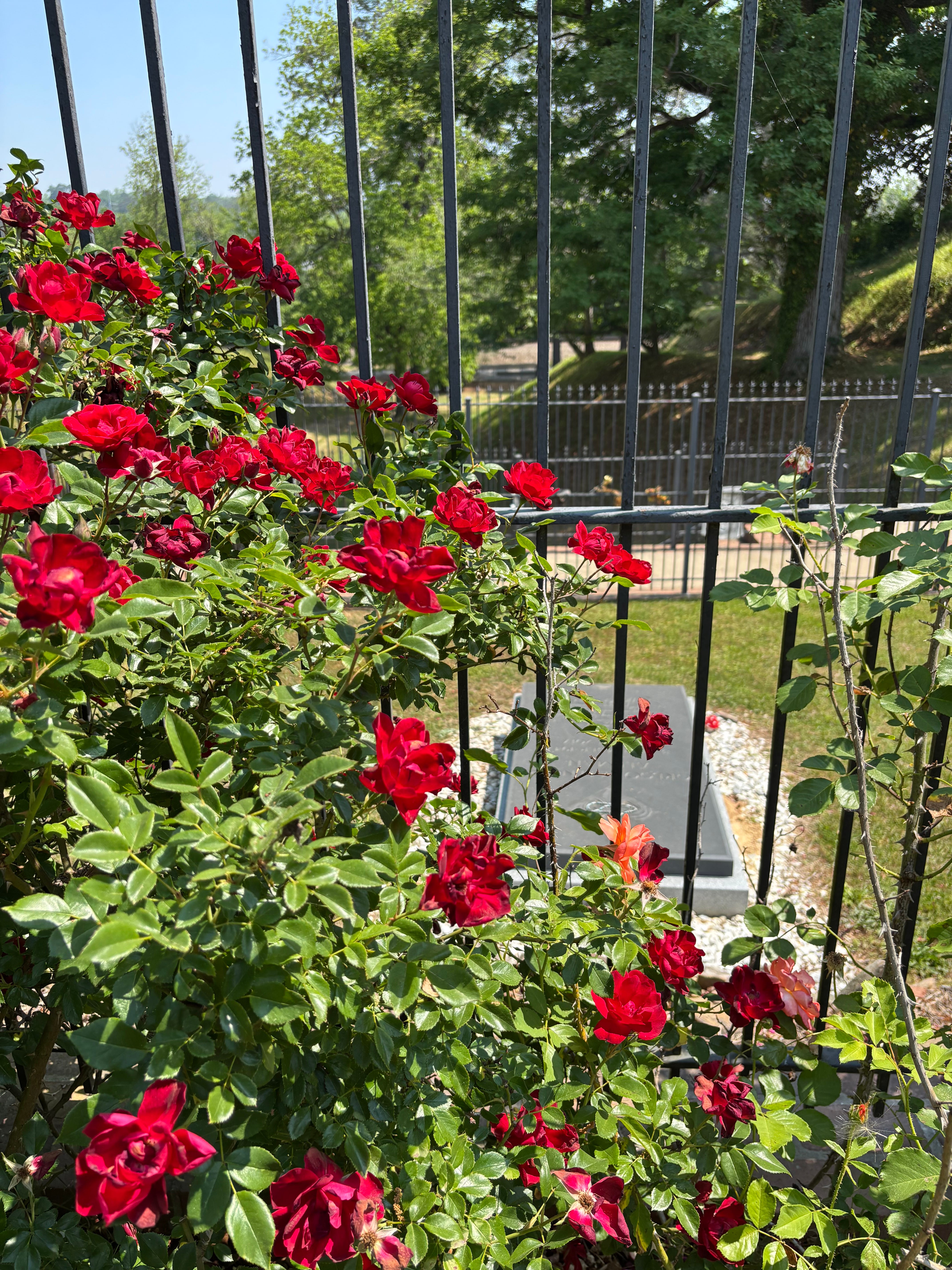 In 1970, their careers on the rise, the Allmans decided to rent a studio space down in Lizella, about ten miles from Macon, and dubbed their little cabin “Idlewild South.” Their second album, named for the cabin, was the Allman Brothers’ breakout record, and Macon remained their base as fame took them in fast and mad directions. 24-year-old Duane Allman wrecked his Harley-Davidson at the quiet intersection of Hillcrest Avenue and Bartlett Street on October 29, 1971, and died that afternoon at the Middle Georgia Medical Center. The following year, Berry Oakley, 24, was on his motorcycle when he skidded into a bus, and died that night of a fractured skull. Gregg Allman and Butch Trucks, lost to us in more recent years after legendary lives as artists, now lie in Rose Hill Cemetery with Duane and Berry. The peaceful plot is adjacent to graves of hundreds of Confederate soldiers from all states who died in Georgia, and of those of local families. It overlooks a lonesome stretch of railroad tracks where travelers and freight are always moving on. On April 22, all the soldiers’ graves bore small flags; the fourth Monday in April is no longer Confederate Memorial Day, but remains a paid state holiday in Georgia. The musical brothers’ graves are planted roundabout with roses of all colors in full bloom, and marked with tributes from fans left at the cemetery fence: a harmonica, glass slides, bandanas, flowers, notes, drumsticks, picks.