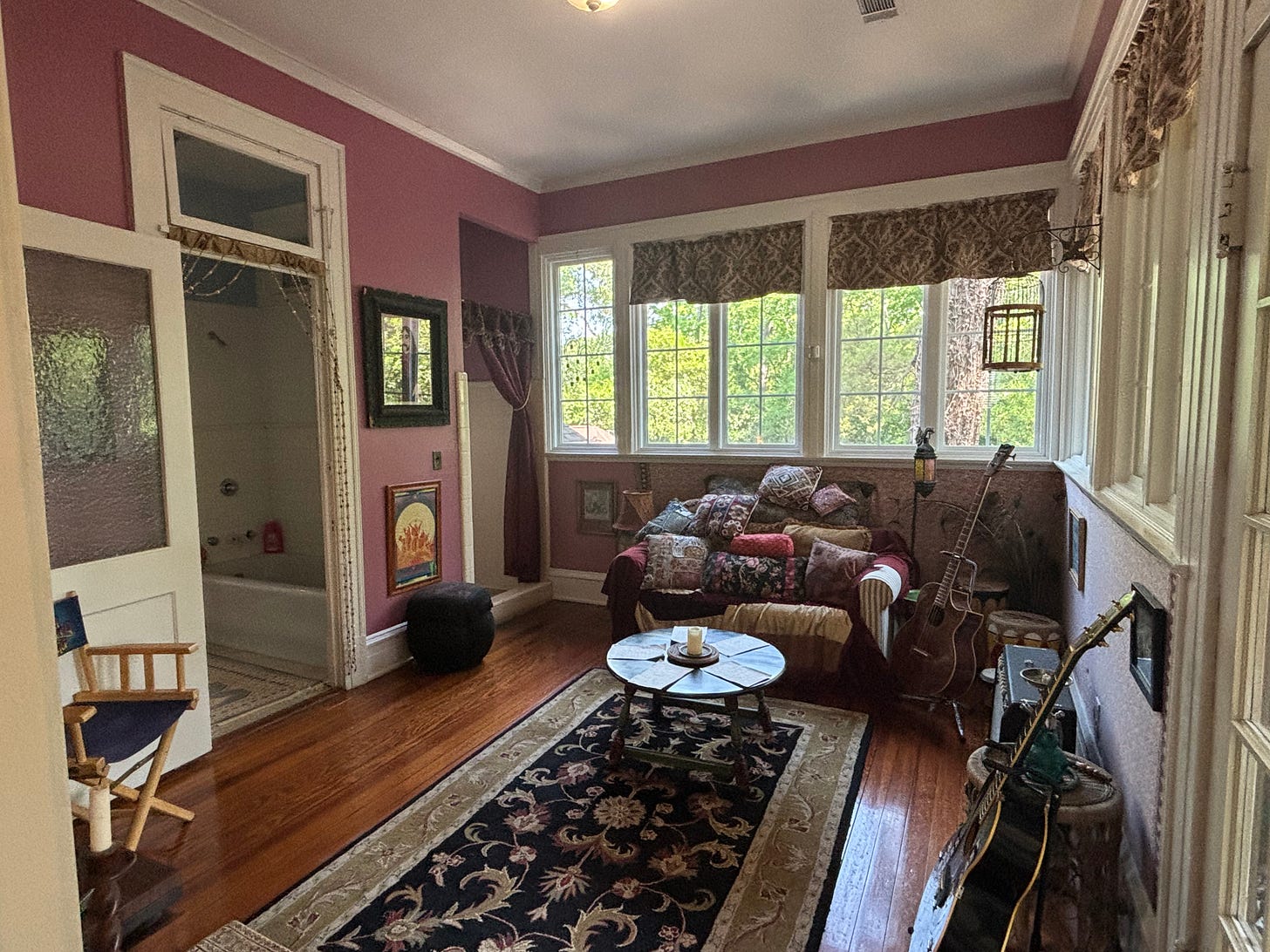 Their lives are celebrated today in the Big House Museum, where their former residence is stuffed full of musical instruments, stage-worn clothes, and other memorabilia, and the men’s upstairs bedrooms and bathrooms and lounging-around rooms look as if they’ve just walked out for a moment: heavy old oak bedsteads, dozens of needlepoint pillows, blue-jean and velvet jackets on pegs, and Khalil Gibran volumes on the mantelpieces.