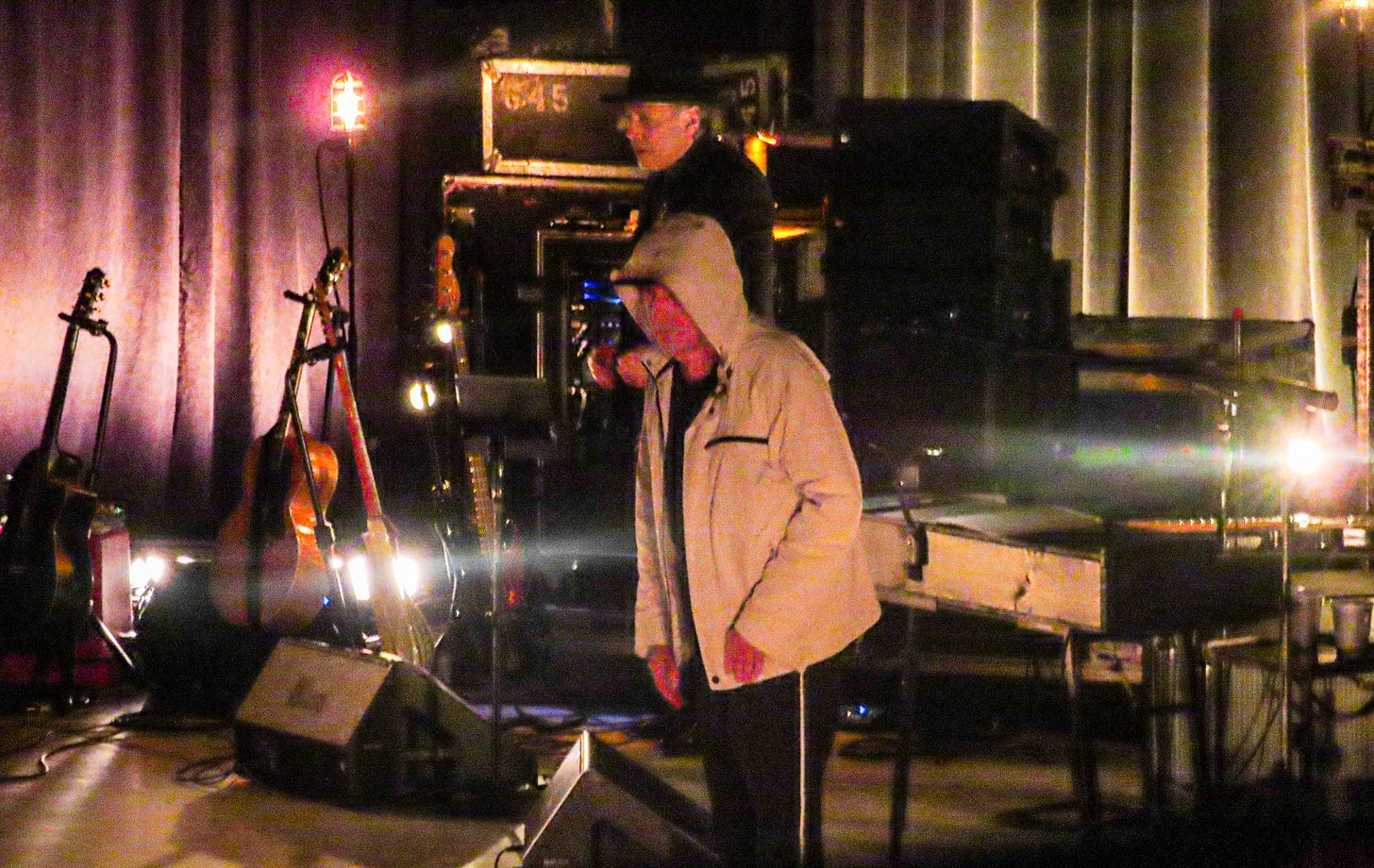 The whole Dylan concert was just that, a beautiful thing of gentle grace. From the lack of a shouting marquee—the City Auditorium announces only itself—to the early-arriving and slowly walking crowd of people of all ages, to the orderly long merch lines and soft conversation in the dimly lit oval of the concert hall, an almost unsettling calm prevailed. When Dylan and the band came on stage at 8:05, the audience stood and cheered in welcome, but quickly subsided and paid attention. Happy applause and whistles and the occasional Southern yee-haa after every song, but quiet and enjoying (except for the two chatty Chi O sorority sisters right in front of me, who departed at “False Prophet” and did not return, hurrah). The keyboard he’s using hardly hides Dylan from his audience: he sat last night front and center, with his pale hooded jacket over his top half. Instead of fussing with his hair, now he likes to adjust the cap under its hood. Occasionally he sips a drink, leaning to his left.
