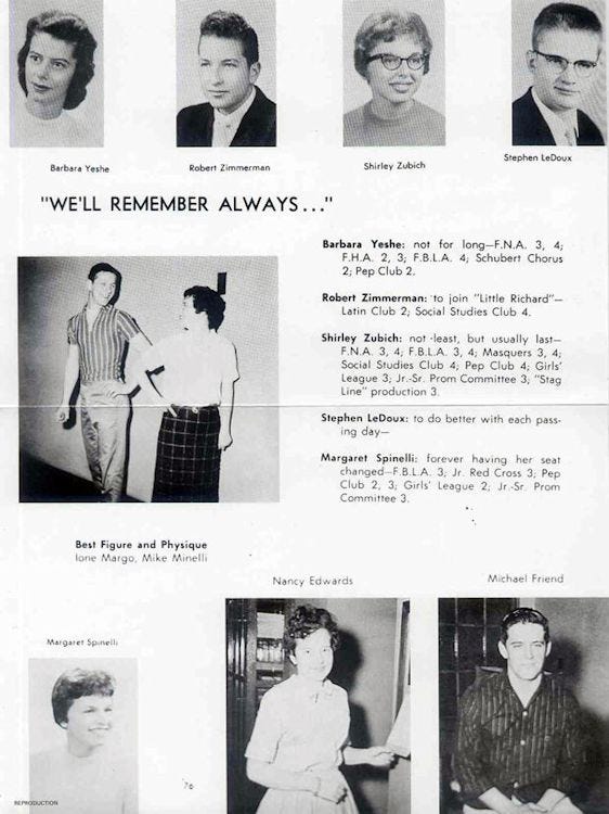 Back in 1958, Bob Zimmerman styled his hair in a wild curly pompadour, and the following year the Hibbing High Hematite yearbook predicted Bob’s future: “to join Little Richard.”