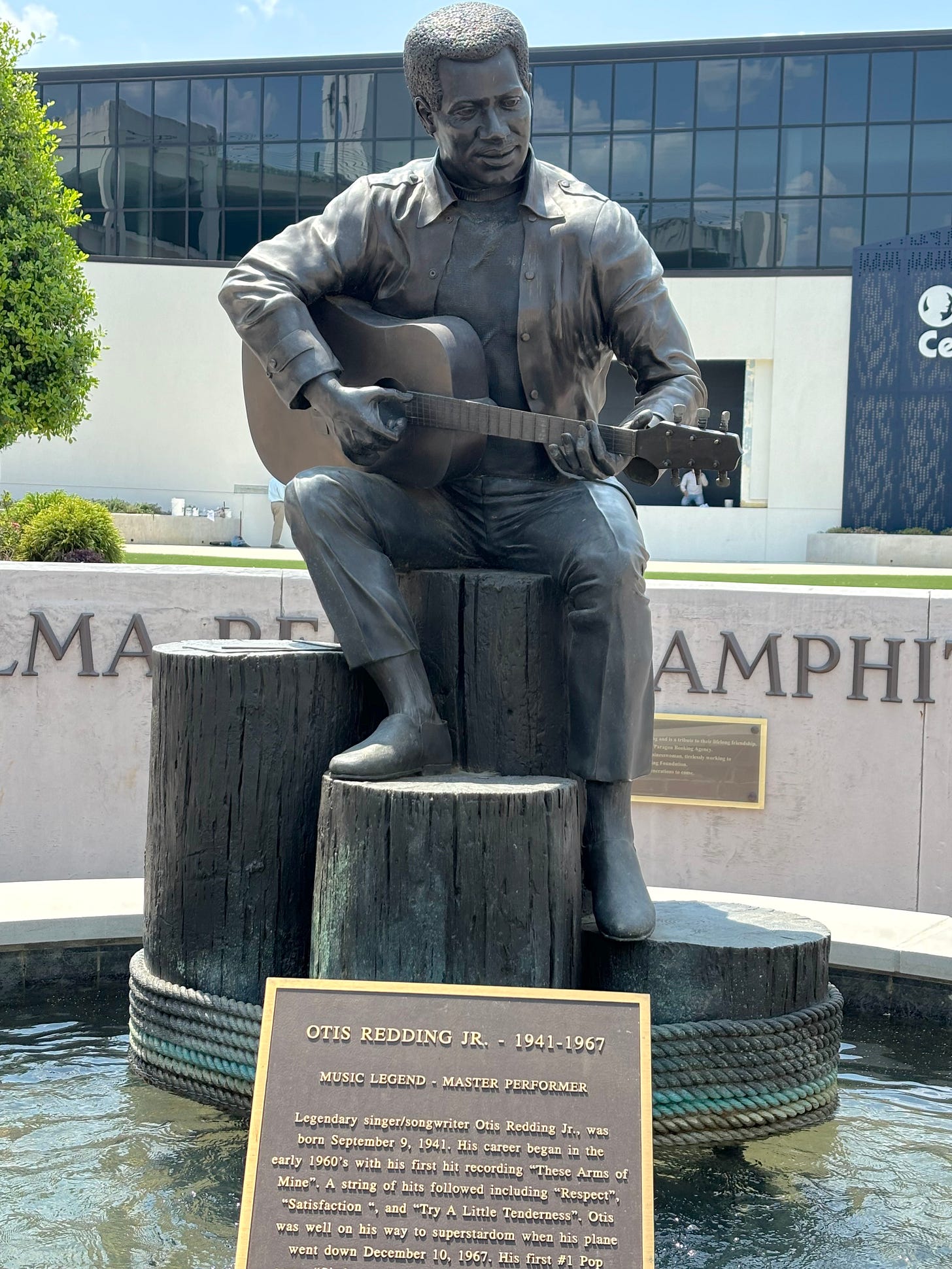 Today there is a beautiful sculpture of Redding, sitting on rope-bound dock pilings, with a pencil and paper atop one, holding a guitar and working out the song he wrote with Steve Cropper. It’s surrounded by water that bubbles gently and constantly. The sculpture stands in front of the Otis Redding Center, a magnificent building that opened in March 2025 for central Georgia’s school-age students (5-18) interested in all aspects of music, from performance and composition to graphic design, stage sets, entertainment law, and planning a tour.