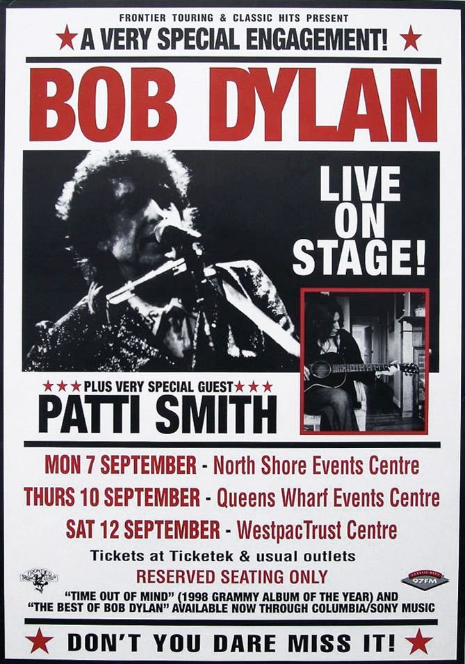 In 1998, Patti Smith and Her Band opened for Bob Dylan and His Band. This is not their famous tour together with the “Dark Eyes” duets that I explored in depth here. That was December 1995. Two-and-a-half years later, they did it again, down in Australia. Patti Smith didn’t sit in with Dylan this time, which is the big reason it’s not known as well (also: Australia).