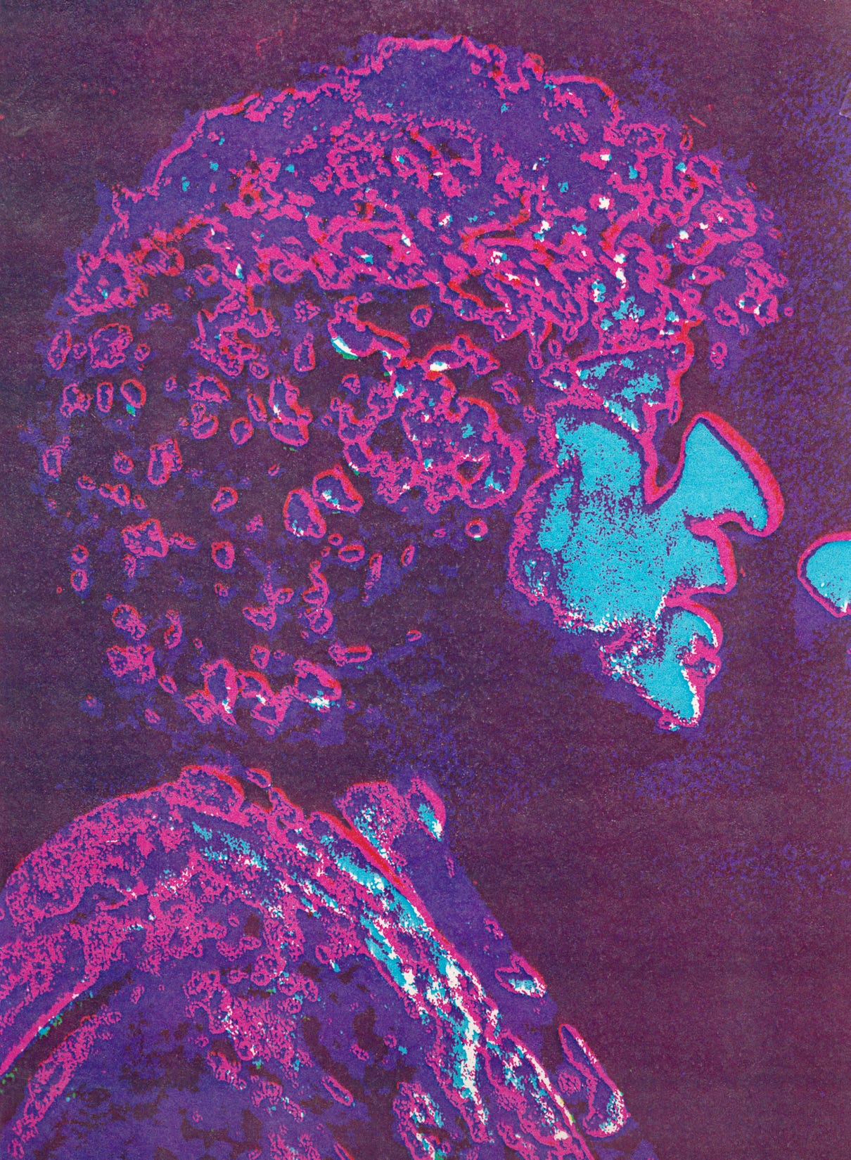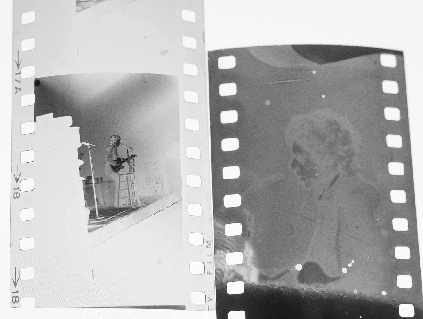 So I was enlarging the image onto pieces of camera film such that it was just Dylan’s head and shoulders. The idea being when I developed that film and put it in the enlarger, I could make a print of just Dylan’s head. The first piece of film is a negative: what was light in the actual scene is now dark. When you print that onto a piece of photographic paper (or another piece of film) you get a positive. Then you can print it on another piece of film and get it back to negative, and then make the positive print from that.