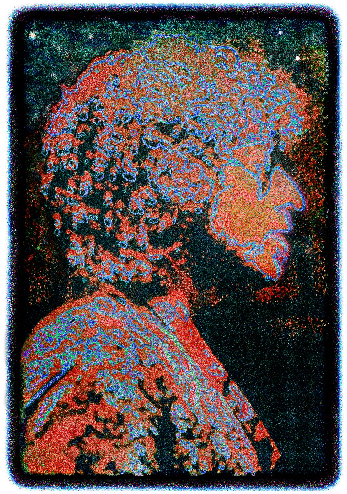 I made the actual print with the first color Xerox machine, which was a very clunky thing. It was a three-color machine, and it made three passes, one for each color. So you could put three different prints on it. You could slide one out and put in another. I would put different ones on for the different passes so you get all these different color combinations.