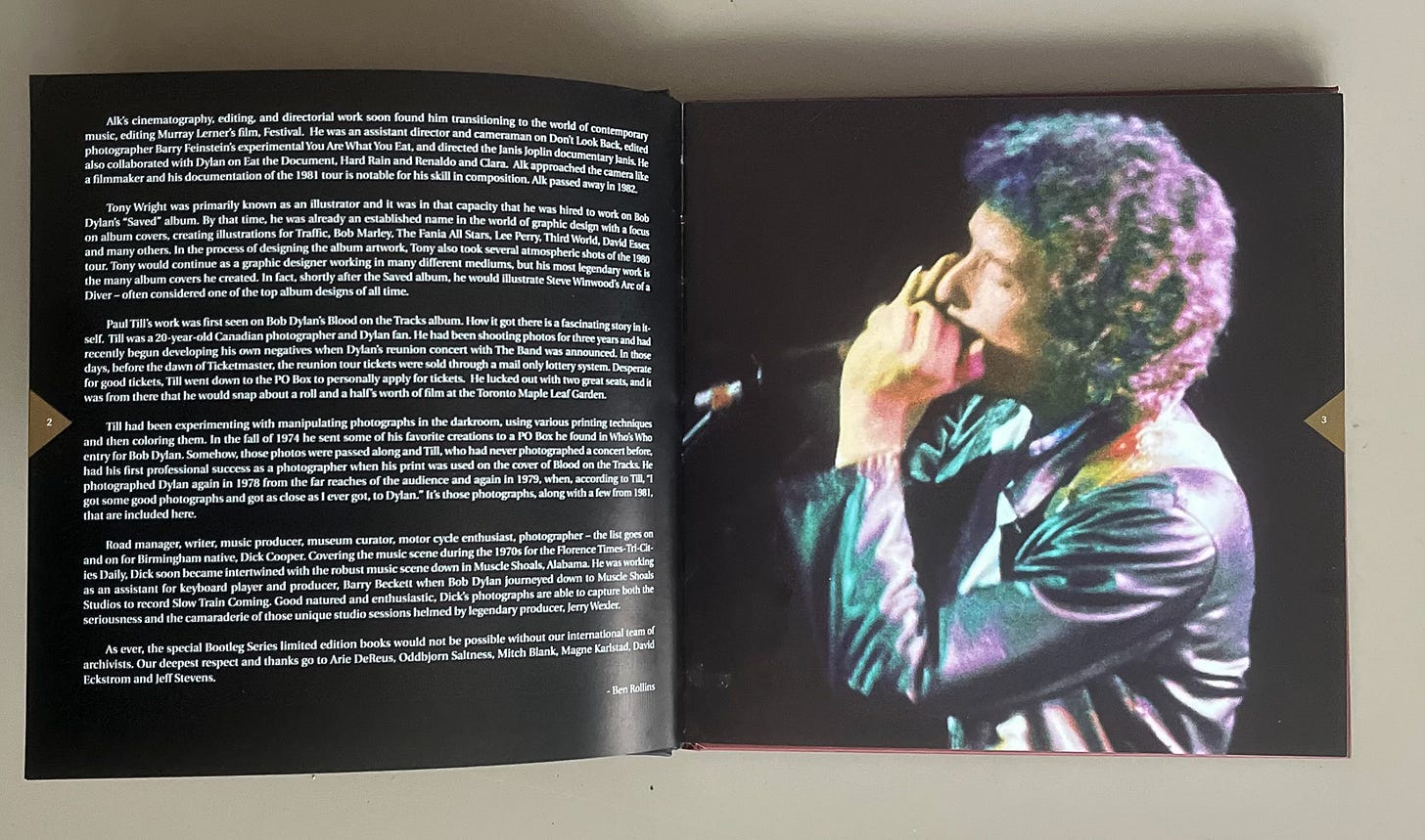 Today, 50 years later, Till shares on an in-depth look at how that photograph and album cover came about, and tells me about some other photos he’s taken of Dylan in concert over the years, several of which were also licensed for official Dylan products (songbooks, Bootleg Series installments, etc). He also shares some Dylan photos that haven’t been seen before.