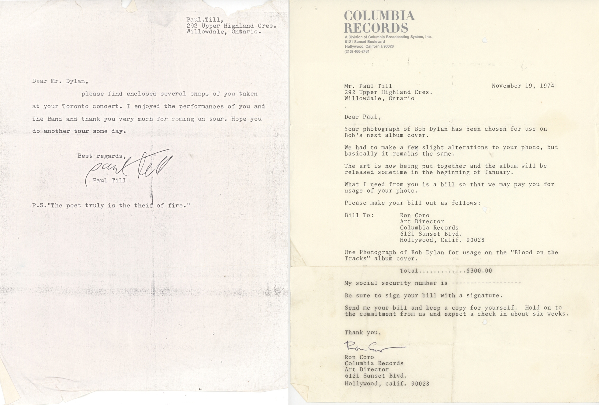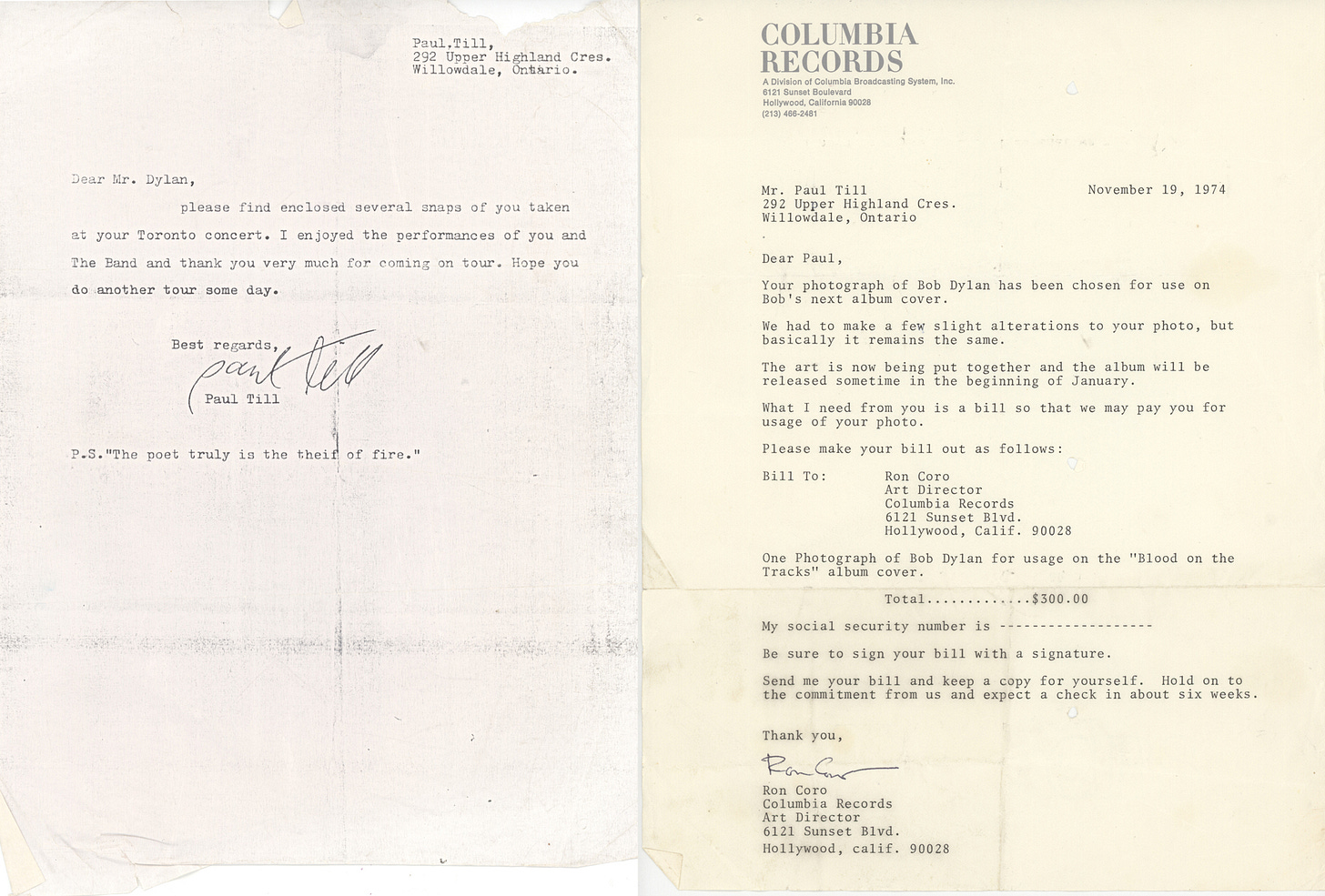 The photographer, and photo-manipulator, was Paul Till. At the time he was a 20-year-old college dropout who mailed the Dylan office his concert photo on a whim. Months later, he got a letter back. It began, “Dear Paul, Your photograph of Bob Dylan has been chosen for use on Bob’s next album cover…” (see actual letter below).