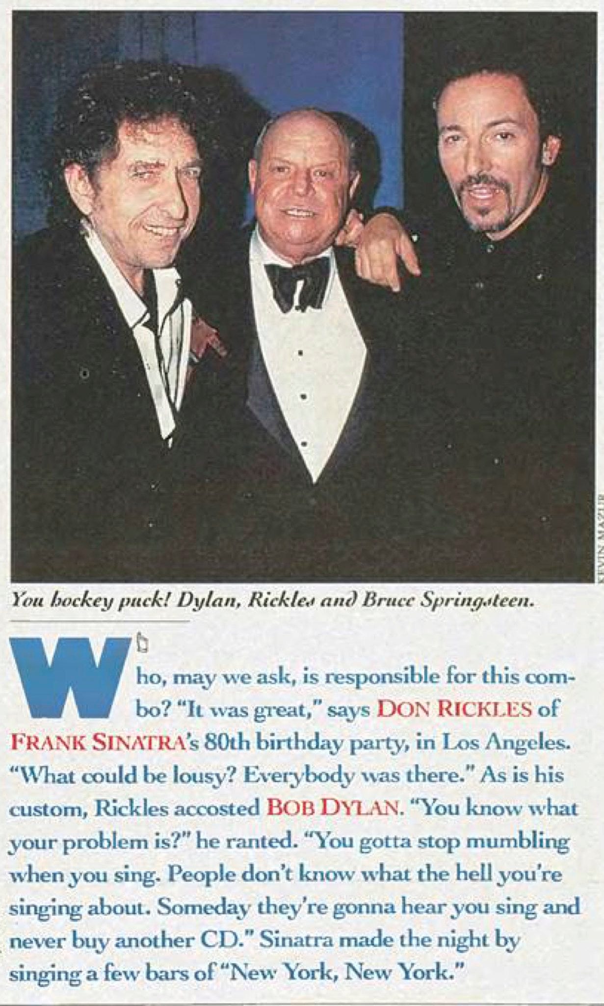 One such special was done to celebrate the 80th birthday of Schlatter’s friend Frank Sinatra. It was taped 30 years ago today. Titled Sinatra: 80 Years My Way, it featured musicians like Ray Charles, Bruce Springsteen, Tony Bennett, Little Richard, and, of course, Bob Dylan. Most stars did Sinatra songs, but Dylan performed his own “Restless Farewell,” reportedly at Frank’s request.