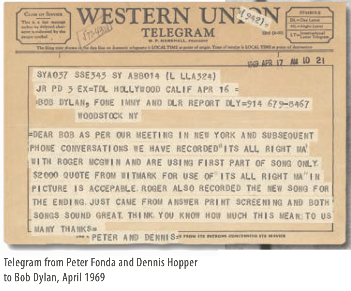 The Dylan Center in Tulsa put out a book a year or two ago, and there’s this great Western Union telegram from Dennis Hopper and Peter Fonda to Bob, talking about how they got you to cover “It’s Alright Ma” for the movie.