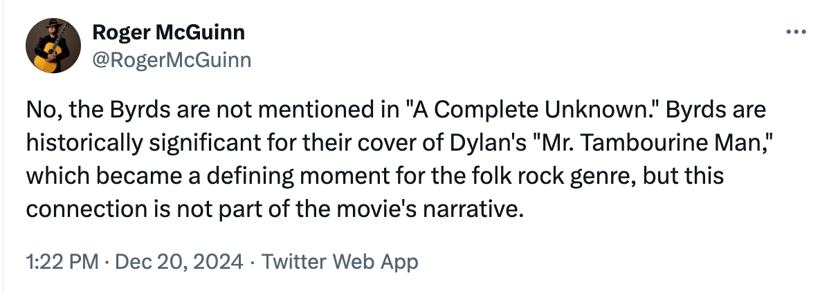 I saw a recent tweet where you were, I don’t know if miffed is the word, but you were at least commenting on The Byrds not being included in that movie.
