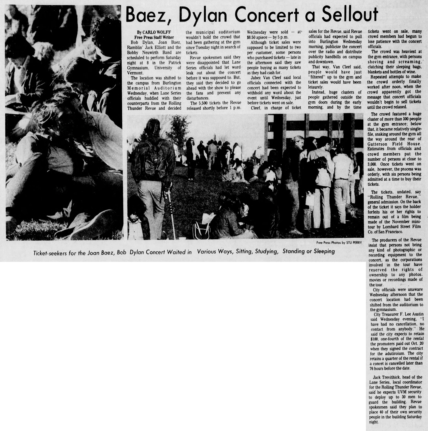 One of the people in charge of announcing and selling these shows on such short notice was Jabez Van Cleef. He would travel a few days ahead of the tour, trying to get the word out that—surprise!—Bob Dylan was about to perform in their town (with Joan Baez and Roger McGuinn, no less). Van Cleef was what’s known in the biz as an advance man, arriving ahead of everyone else to get things set up and sell tickets.