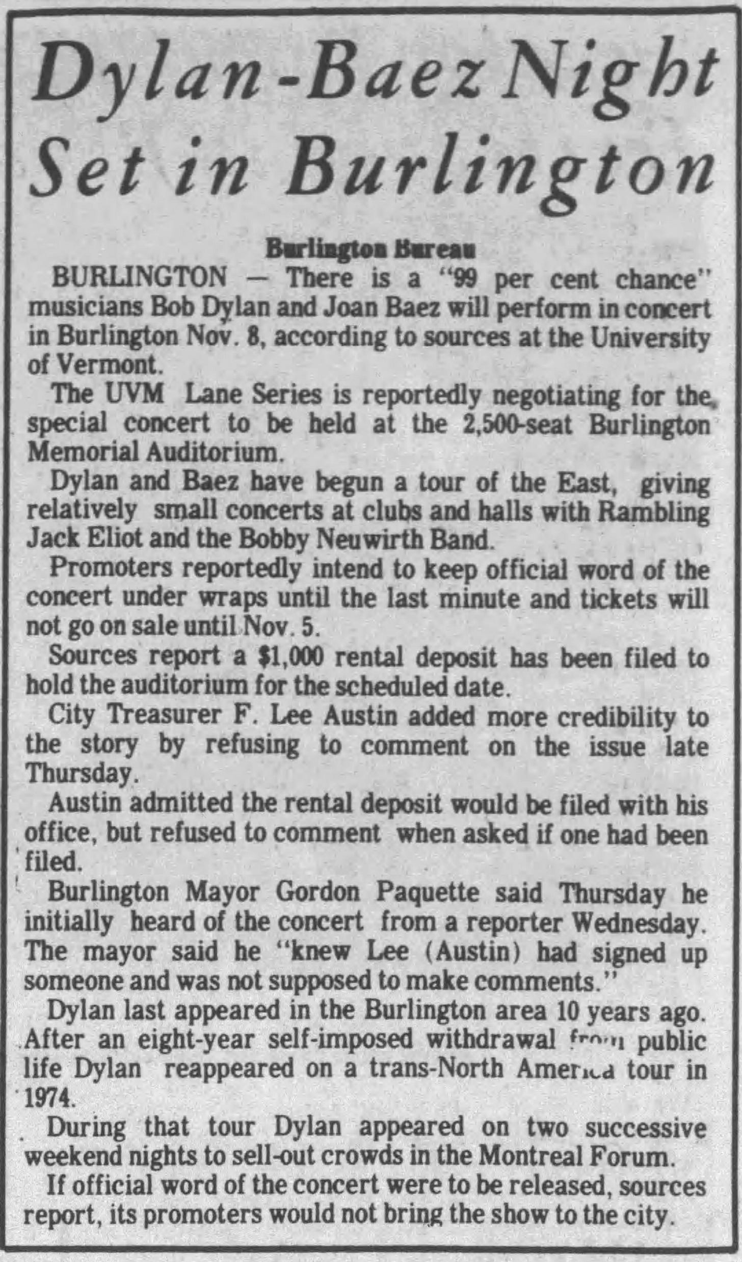 The biggest problem that they would encounter in pulling off their expected sequence of events was preventing the [local] promoter people from leaking the information about the event. In fact, it’s interesting that you’re living in Burlington, because Burlington was probably the biggest violation of the conventional sequence of events.