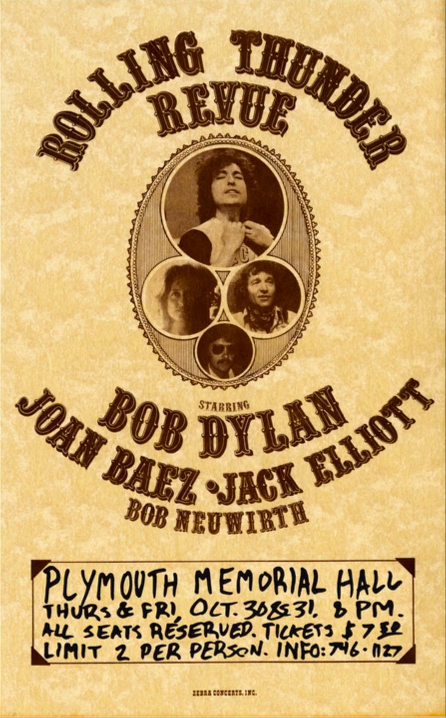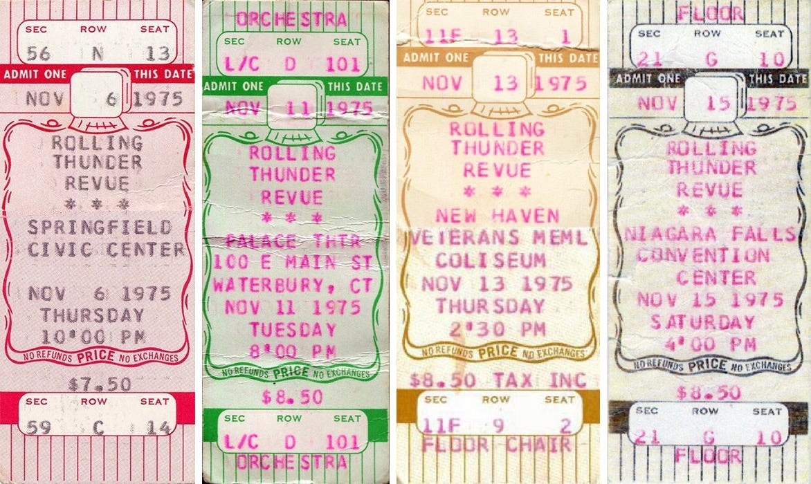 So much of the lore of Rolling Thunder is that tickets went on sale just a few days before. Correct me if this is wrong, but basically some guys roll into town with some fliers and say, Bob Dylan’s playing here on Thursday night.